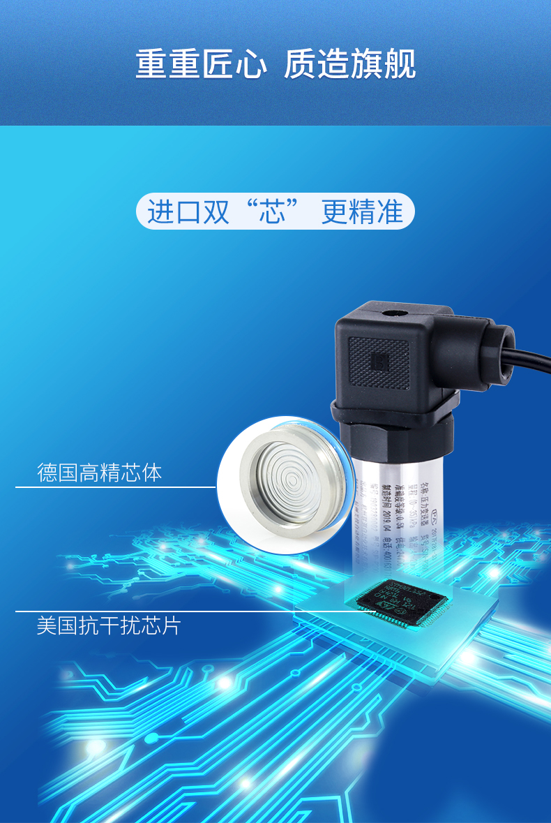 簡(jiǎn)要描述:擴(kuò)散硅壓力變送器選用進(jìn)口高精度、高穩(wěn)定性壓力 敏感芯片。敏感芯片采用先進(jìn)的微機(jī)械刻蝕加工工藝, 通過(guò)在硅片上擴(kuò)散四個(gè)高精度電阻,從而形成惠斯通電 橋。